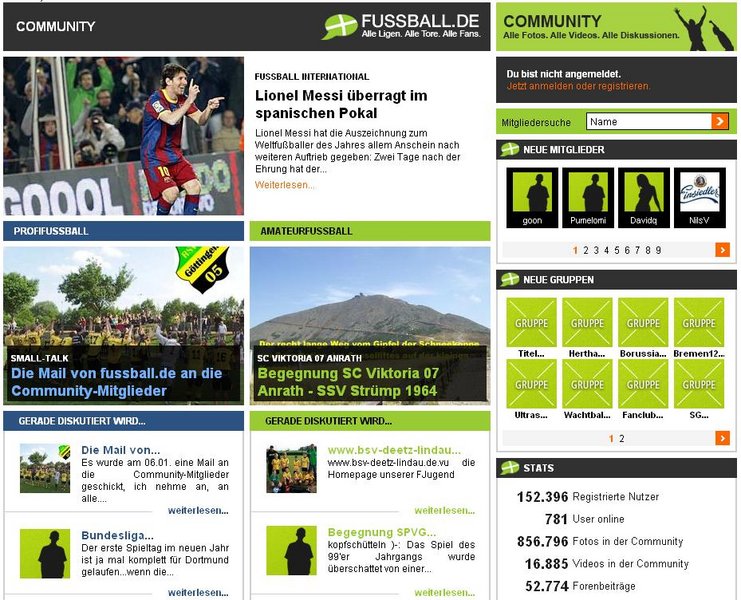 Jeder Verein, von der Bundesliga bis zur Kreisklasse, hat auf FUSSBALL.DE sein eigenes Forum. Darüber hinaus sind redaktionelle Artikel aus dem Profi- und Amateurbereich nun Bestandteil der Community und können sogleich in den Foren kommentiert oder diskutiert werden. Die übersichtliche Struktur sowie eine Suchfunktion für Beiträge jeglicher Art ermöglichen eine schnelle und einfache Navigation. Auch die Vereinstartseiten haben im Zuge des Relaunchs ein neues Gesicht erhalten und bieten über die Mannschaftsübersicht einen umweglosen Zugang zum Ergebnisdienst der jeweiligen Meisterschaftsstaffel. Falls Sie bereits Mitglied der FUSSBALL.DE-Community sind, können Sie sich wie gewohnt einloggen und finden in Ihrem Profil alle persönlichen Angaben, Nachrichten, Bilder und Videos aus der bisherigen Community.