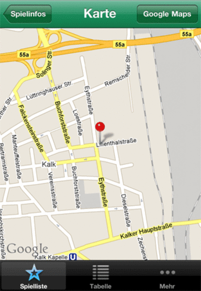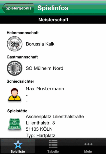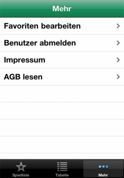 Im unteren Bereich ist die Navigationsleiste mit den Ansichten „Spieleliste“, „Tabelle“ und „Mehr“ zu sehen.
