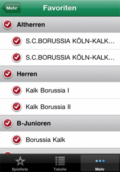 Über die Favoritenverwaltung können Sie festlegen, welche Vereinsmannschaften in der Spieleliste vorgeblendet werden sollen. Beispiel: Wählen Sie ausschließlich Herrenmannschaften aus, werden auch nur die Spiele/Tabellen der Herrenmannschaften angezeigt. Über den Button „Mehr – Favoriten bearbeiten“ können Sie Ihre Auswahl jederzeit ändern.