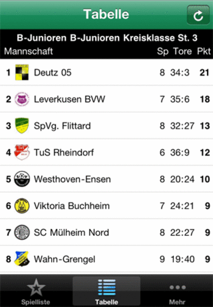 Tabellenstand aktualisieren: Per Klick auf das Icon „Aktualisieren“ (siehe Screen) können Sie die neuesten Tabellenstände abrufen.
