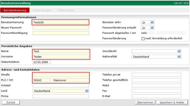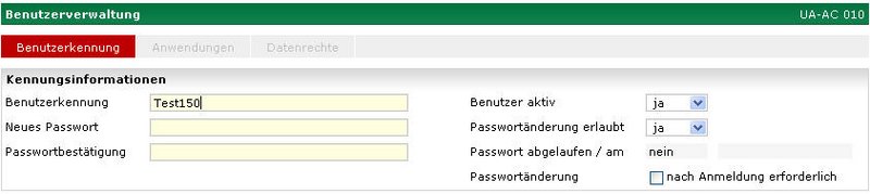 - Benutzer aktiv ja/nein (Defaulteinstellung ist ja, wird nein ausgewählt ist die Kennung nicht aktiv nach der Anlage und der Nutzer kann sich nicht mit der Kennung anmelden)