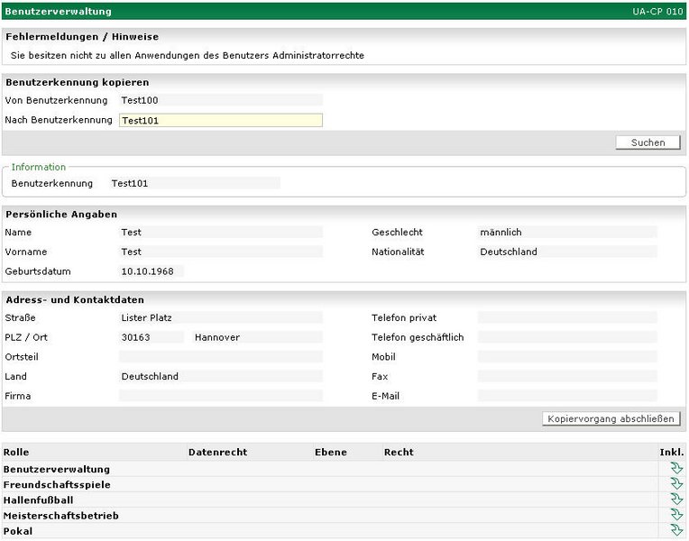 Nachdem Sie sich überzeugt haben, dass die richtige Kennung ausgewählt wurde, werden durch die Aktion „Kopiervorgang abschließen“, die Anwendungen der Quellkennung auf die Zielkennung kopiert. Es werden bei der Zielkennung nur Anwendungen und Datenrechte hinzuaddiert. Es werden keine Datenrechte oder Anwendungen bei der Zielkennung entfernt.