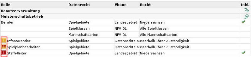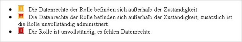Ist eine Rolle vollständig administriert und besitzen Sie mindestens die gleichen Datenrechte, werden Ihnen die Rolle und die dazugehörigen Datenrechte angezeigt. Besitzen Sie nicht die vollen Datenrechte oder ist die Rolle nicht vollständig administriert, wird Ihnen dies über entsprechende Icons angezeigt.