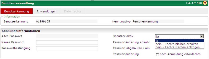 Die Auswahl des Eintrags „Ja“ bewirkt, dass der Benutzer aktiviert wird. Wird der Wert „Nein – Rechte werden entzogen“ ausgewählt, so wird der Benutzer deaktiviert und gleichzeitig werden alle Anwendungen, Rollen und Datenrechte entfernt. Soll ein Benutzer dauerhaft deaktiviert werden, ist diese Option zu bevorzugen.