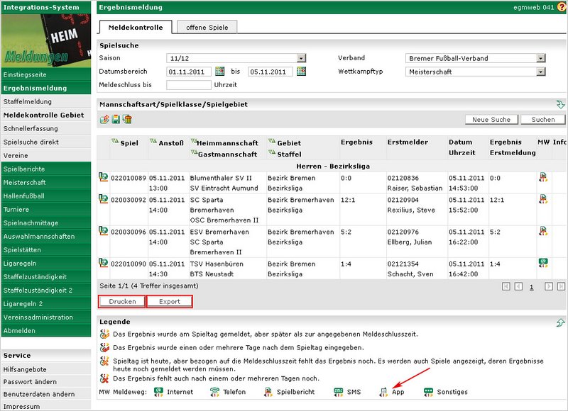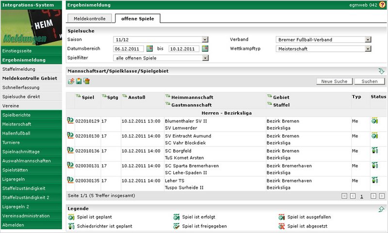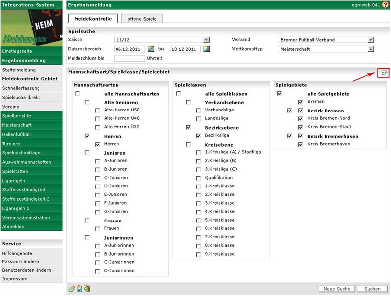 Der angegebene Datumsbereich muss bei der „Meldekontrolle" und bei den „offenen Spielen" innerhalb der angegebenen Saison liegen. Die Suchtreffermenge ist auf 500 begrenzt, d.h. sollte die Suche mehr als 500 Treffer ergeben, muss die Suche eingegrenzt werden. Im Fall der offenen Spiele und Spielfilter „alle offenen Spiele" sollte der Datumsbereich einen Monat nicht überschreiten.