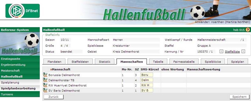 Das SMS-Kürzel einer Mannschaft wird beim Tippspiel auf www.fussball.de für die Kennzeichnung der Mannschaft verwendet. Deshalb ist es wichtig, dass die SMS-Kürzel innerhalb einer Staffel eindeutig sind. Dies wird durch das System überprüft und es werden ggfs. Fehlermeldungen diesbezüglich erzeugt. Das Kürzel kann direkt in der Mannschaftsliste gepflegt werden, auch hier werden die Änderungen wieder über den Funktionsbutton „Speichern“ gültig gemacht.