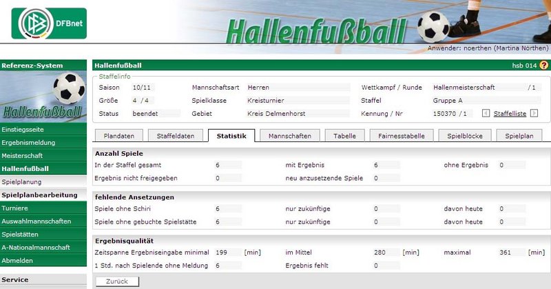 Auf dem Karteireiter „Staffelstatistik“ befinden sich in kompakter Form Informationen zu statistischen Werten über die Spiele in der aktuellen Staffel. Diese sind aufgeteilt in allgemeine Daten über die Spiele der Staffel, schiedsrichterbezogene Daten und ergebnisbezogene Daten über die Spiele der Staffel.