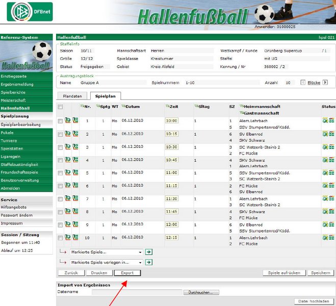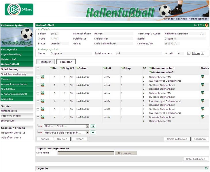 Oft steht in Hallen keine Anbindung an das Internet zur Verfügung oder die Anbindung ist instabil. Um trotzdem die Ergebnisse der einzelnen Spiele melden zu können und die weitere Planung komfortabel im DFBnet durchführen zu können, steht ein Export- und Importtool zur Verfügung. Mit dem Export-Tool können Sie den gesamten Blockspielplan mit all seinen Informationen in einem Excel-Format herunterladen und offline weiter bearbeiten.