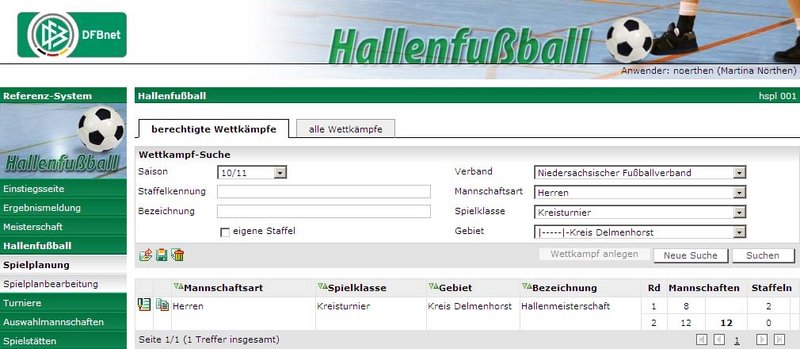 Nach der Auswahl des Menüpunktes Hallenfußball und Unterpunkt Spielplanung erhalten Sie die Suche und Verwaltung von Wettkämpfen.