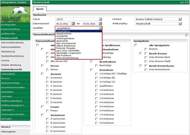 Im Filter können Sie nach Vorauswahl Ihres Verbandes, Mannschaftsarten, Spielklassen und Gebiet markieren. Es werden nur die Verbände/Mannschaftsarten/Spielklassen/Gebiete angeboten, für die Sie ein Datenrecht besitzen.