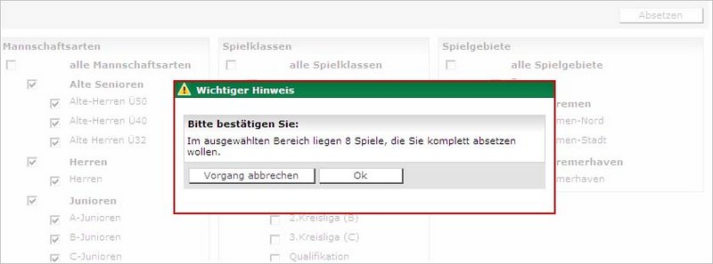 Zunächst erhalten Sie eine Sicherheitsabfrage mit der Anzahl der Spiele, die abgesetzt werden würden, Sie können fortfahren (also wirklich absetzen) oder abbrechen (siehe Screen "Sicherheitsabfrage").