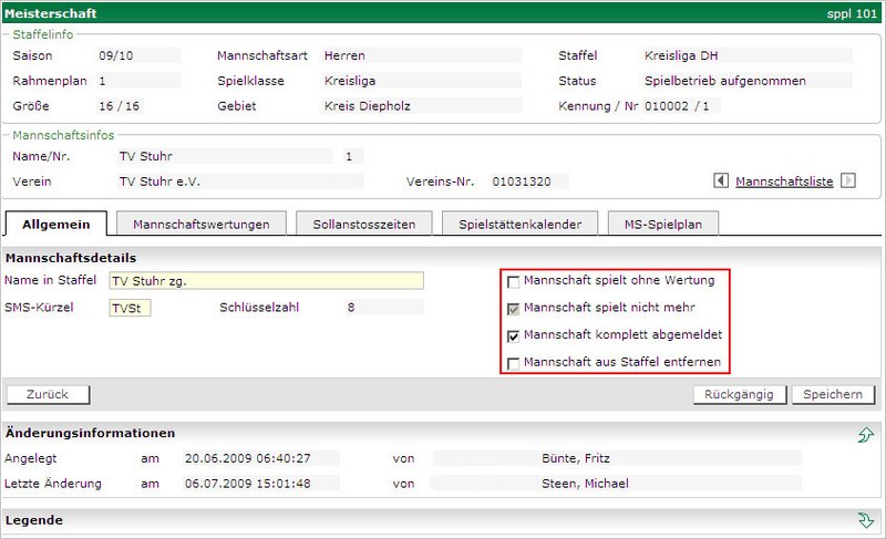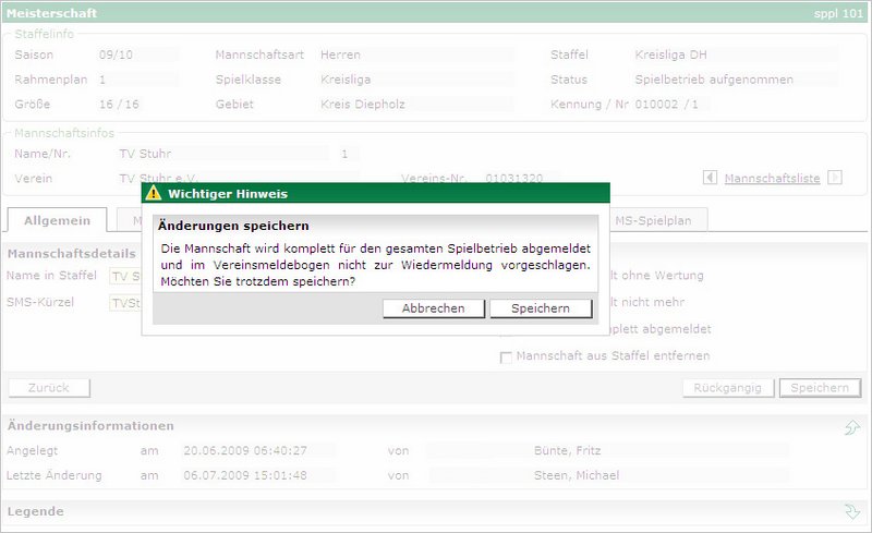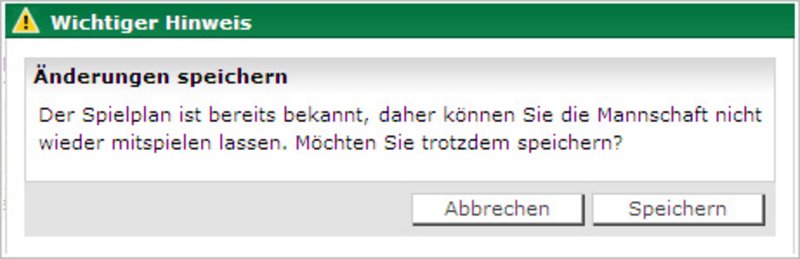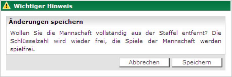 Nachdem der Sicherheitshinweis „Mannschaft spielt nicht mehr“ bestätigt wurde, kann nun diese Mannschaft komplett abgemeldet werden. (siehe Screen „Mannschaft komplett abmelden“)