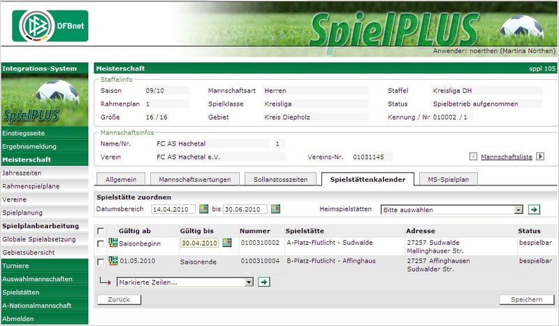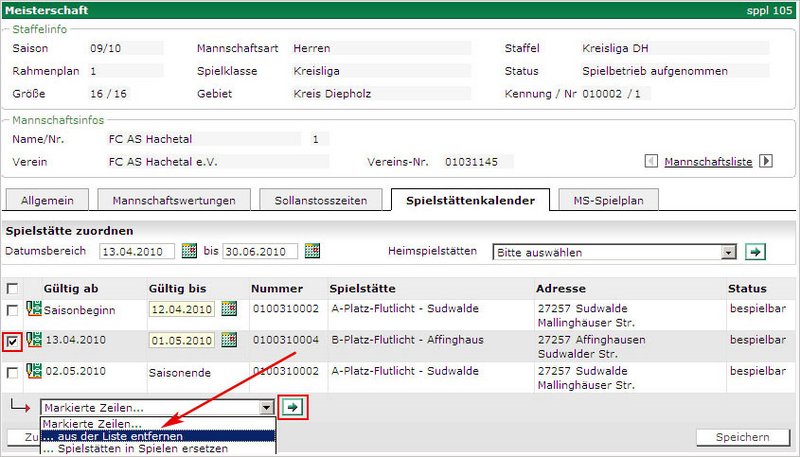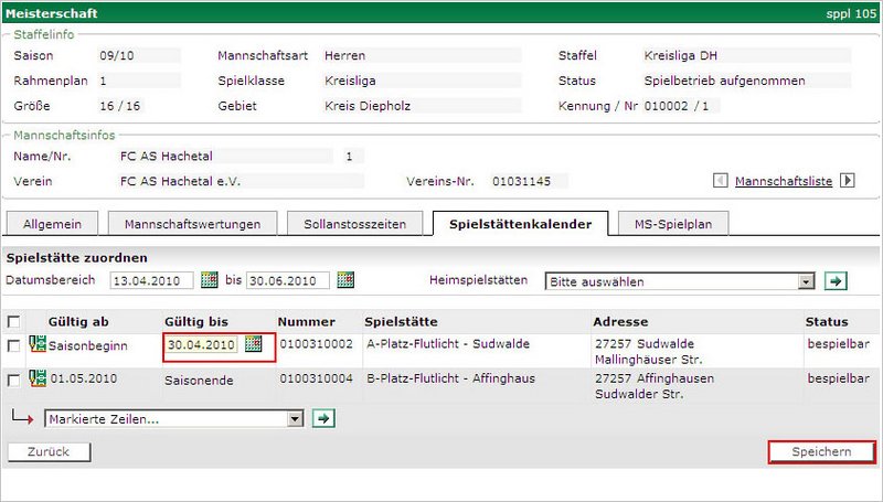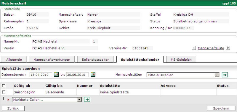 Die Erstpflege dieser Daten erfolgt durch die Vereine im Vereinsmeldebogen, wo je Mannschaft eine Heimspielstätte eingetragen wird. Optional kann dort auch eine 2. Spielstätte für die Rückrunde erfasst werden. (siehe Screen "Spielstättenkalender Hachetal")