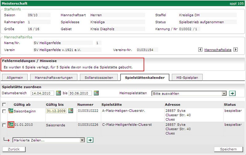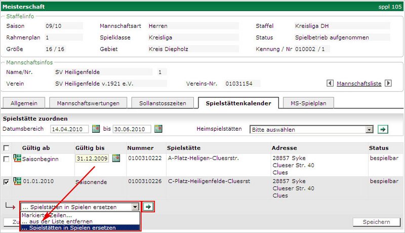 Jetzt werden in allen Heimspielen dieser Mannschaft in Meisterschaftsspielen im gewählten Bereich – hier bis 1.1.2010 – die Spielstätten gewechselt und wenn möglich gebucht.