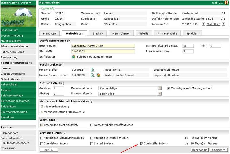 Je Landesverband kann festgelegt werden, ob Staffelleiter es den Vereinen der Staffel erlauben dürfen, die Spielstätte zu wechseln. Staffelleitern können diese Option in der laufenden Saison aktivieren oder deaktivieren, der Status des Spielplans ist nicht relevant. Falls der Spielstättenwechsel wie in diesem Beispiel (siehe Screen) erlaubt ist, dann ist dies nur mit Verlauf zum Spieltermin (hier 10 Tage) möglich. (siehe Screen Staffelparameter: Verein darf Spielstätte ändern.)