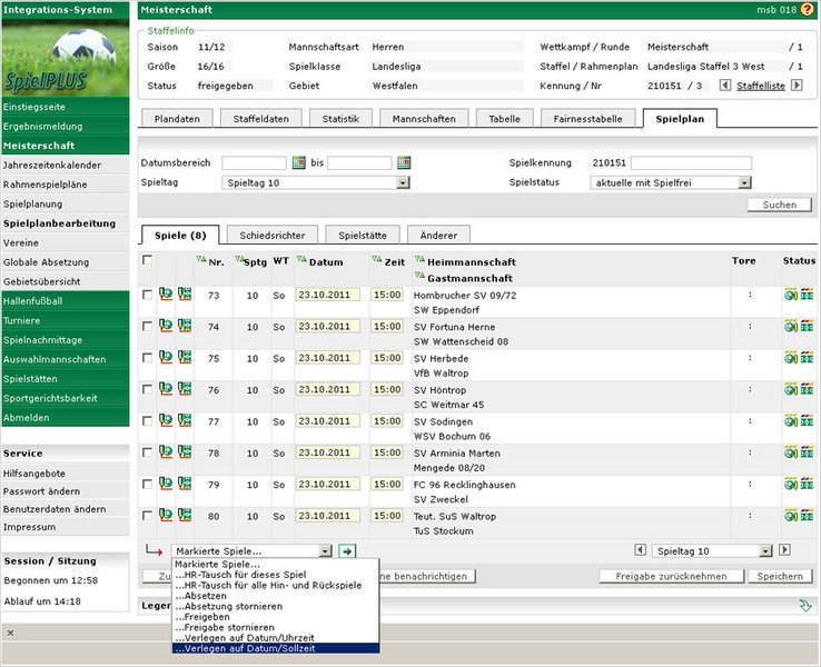 Diese Funktionalität ist auch in Seiten mit Spielelisten (wie Spielplan) mit Markierungsspalte vorhanden. Die Sammelfunktionen sind um die Aktion „… vorlegen auf Datum/Sollzeit“ erweitert worden.
