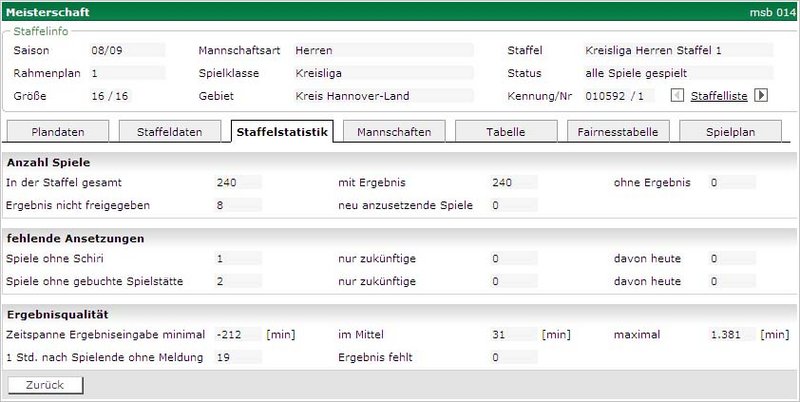 Auf dem Karteireiter „Staffelstatistik“ befinden sich in kompakter Form Informationen zu statistischen Werten über die Spiele in der aktuellen Staffel. Diese sind aufgeteilt in allgemeine Daten über die Spiele der Staffel, schiedsrichterbezogene Daten und ergebnisbezogene Daten über die Spiele der Staffel.