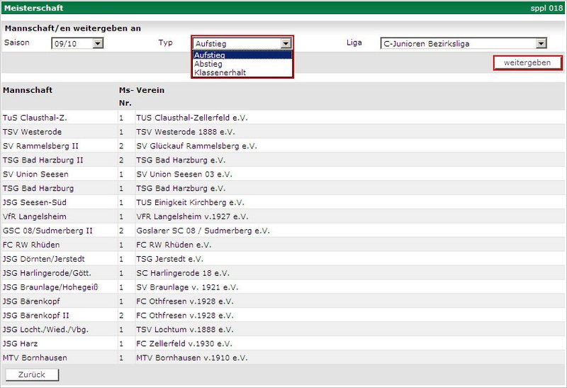 Mit Klick auf „weitergeben“ lösen Sie den Auf-, Abstieg, Klassenerhalt aus, Sie gelangen wieder auf die Seite Mannschaftszuordnung und sehen, wohin Sie die Mannschaften weitergegeben haben.