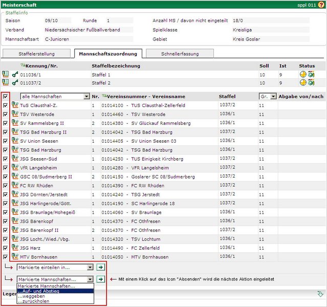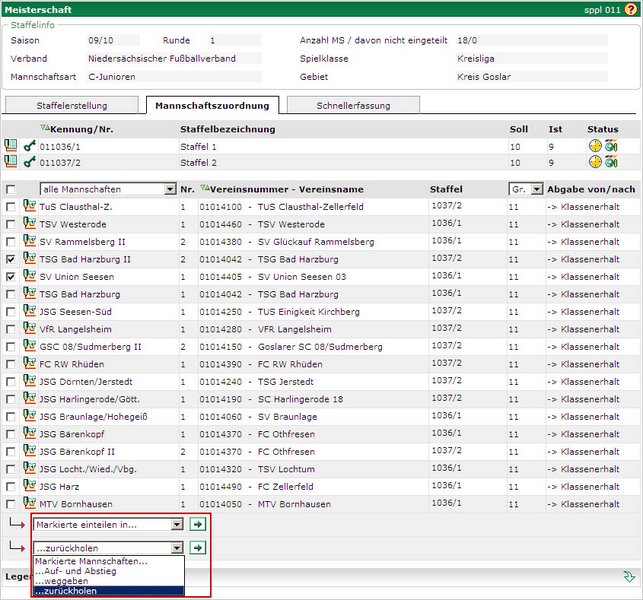 Hierzu markieren Sie alle Mannschaften, die Sie auf diese Weise weitergeben wollen. In dem folgenden Beispiel soll für alle Mannschaften der 1. und 2. Staffel „Klassenerhalt durchgeführt werden.