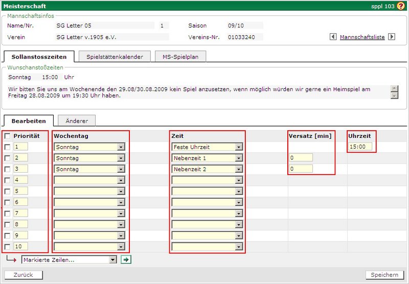 Durch Bearbeiten der Sollanstoßzeiten je Mannschaft in Kombination mit dem Erfassen von Nebenzeiten im Jahreszeitenkalender können die Anstoßzeiten nicht nur dem Jahresverlauf entsprechend, sondern auch individuell pro Mannschaft in den Spielplan generiert werden.