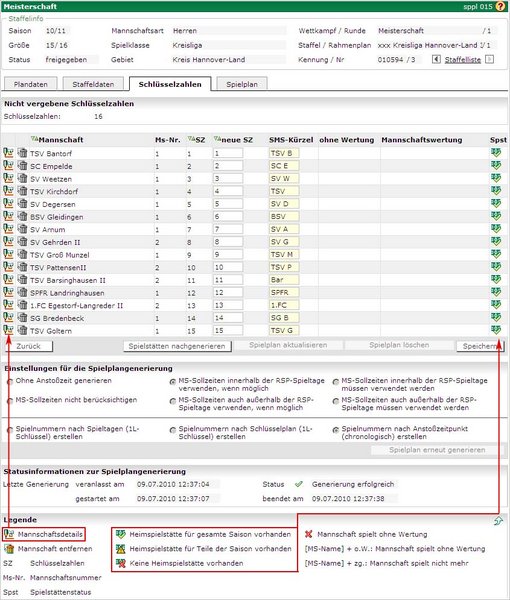 Werden bei der Schlüsselzahlenzuordnung Veränderungen vorgenommen, kann über den Button Spielplan aktualisieren der Spielplan aktualisiert werden.