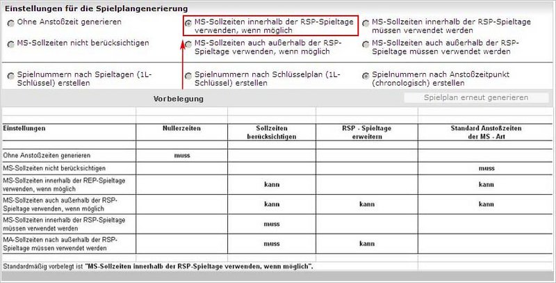 Es ist die Auswahl der Einstellungen für die Spielplangenerierung über eine der 6 Radioboxen vorzunehmen. Die Auswirkungen auf die Spielplangenerierung sind unten beschrieben.