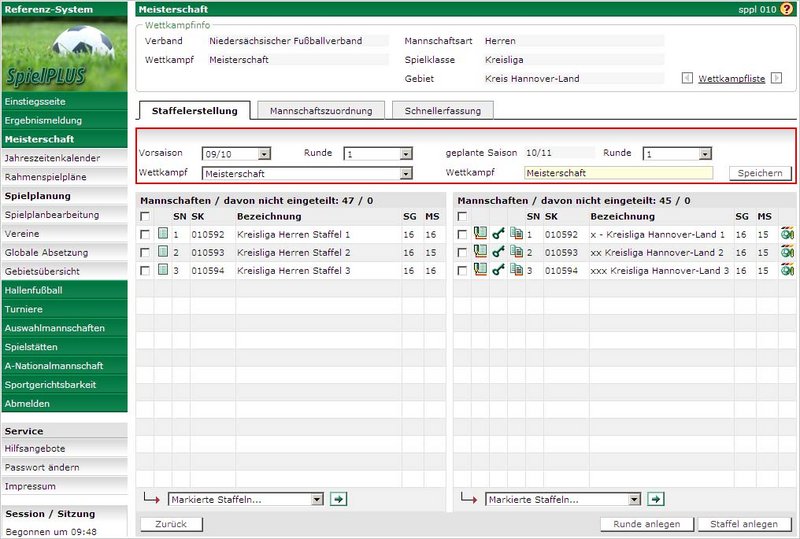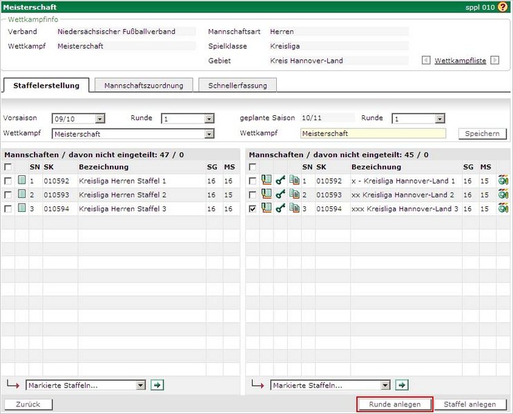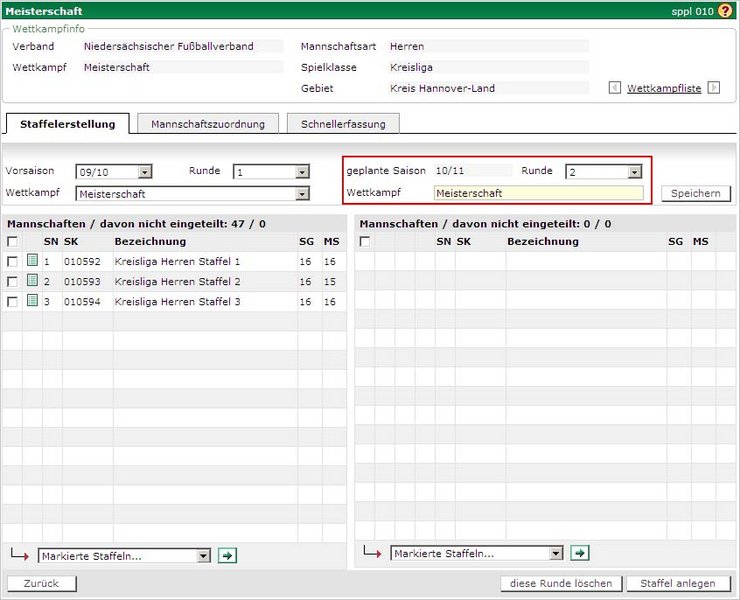 Im rechten Bereich können Staffeln und/oder Runden innerhalb der zu planenden Saison über