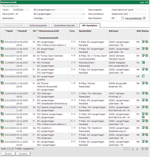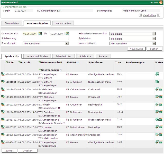 Der Vereinsspielplan wird über den gleichnamigen Karteireiter angezeigt. Die zu ermittelnden Spiele können über die Kriterien: