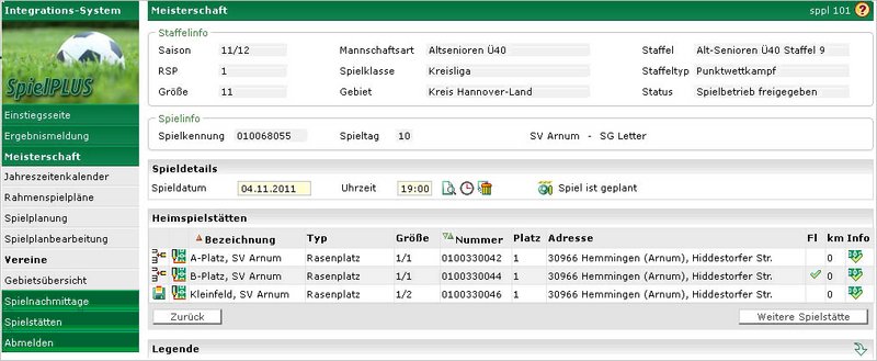 Sofern Ihr Verein berechtigt wurde, Spielstätten für Heimspiele zu wechseln, können Sie mit der Auswahl des Icons „Spieldetails bearbeiten“ das gewünschte Spiel aufrufen (siehe Screen "Spieldetails").