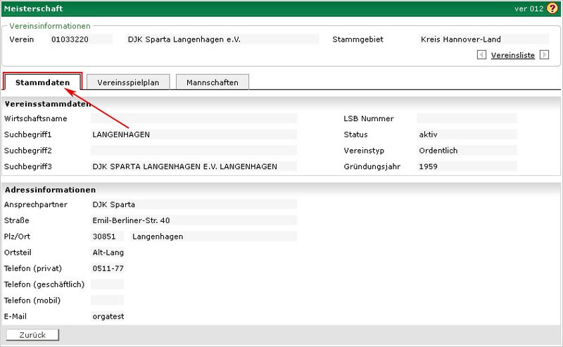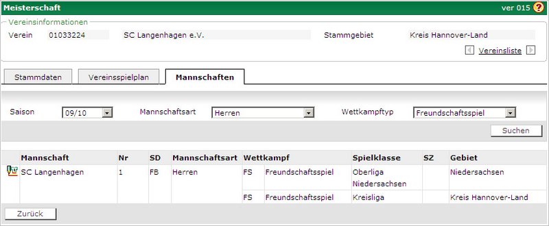 Über diesen Karteireiter können Sie sich einen Überblick über die Mannschaften des ausgewählten Vereins verschaffen. Hier wird auch aufgelistet, in welchem Wettbewerb die jeweilige Mannschaft antritt.