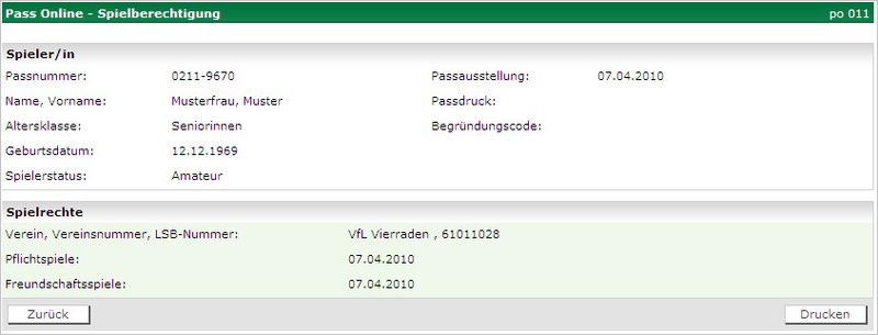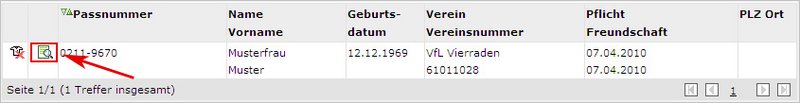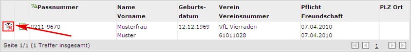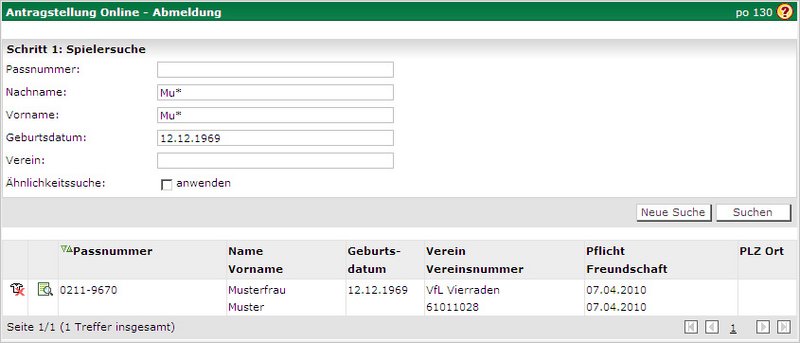 Soll ein Spieler abgemeldet werden, muss dieser zunächst in der Datenbank ermittelt werden. Geben Sie im "Schritt 1: Spielersuche" in das Feld „Passnummer“ die entsprechende Passnummer des Spielers vollständig ein, alternativ können Sie auch den Nachnamen, Vornamen und Geburtsdatum eingeben und die Suche starten.