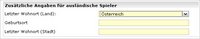 Sollte die Angabe des Landes von dem tatsächlichen Wohnort abweichen, ist dieser entsprechend auszuwählen. (siehe Screen zusätzliche Angaben für ausländische Spieler)