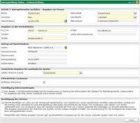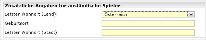 Für Spieler ausländischer Staatsangehörigkeit, die erstmals eine Spielerlaubnis im Mitgliedsland erwerben wollen, oder Spieler deren letzter Wohnort im Ausland lag, müssen zusätzliche Angaben gemacht werden. Standardmäßig ist dieses Feld mit dem Wert aus der Nationalität vor belegt.