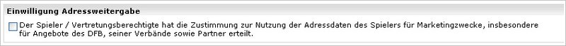 Durch Markieren der entsprechenden Checkbox wird die Einwilligung zur Adressweitergabe erklärt (Adressweitergabe: erlaubt). Durch deaktivieren der Checkbox erklärt der Spieler/gesetzliche Vertreter, bzw. stellvertretend der Antrag stellende Verein den Widerspruch zur Adressweitergabe (Adressweitergabe: Nicht erlaubt). Die Standardeinstellung ist deaktiviert, somit wird standardmäßig der Adressweitergabe nicht zugestimmt.