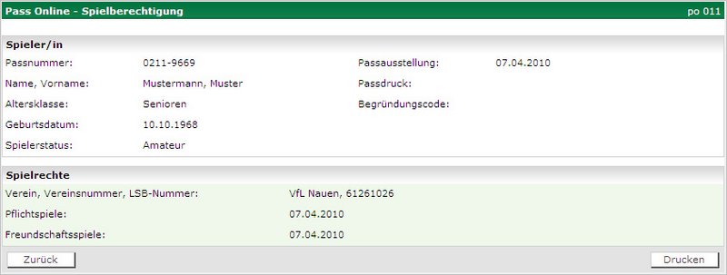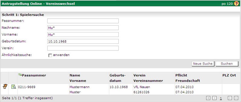 Geben Sie im "Schritt 1: Spielersuche" in das Feld „Passnummer“ die entsprechende Passnummer des Spielers vollständig ein, alternativ können Sie auch den Nachnamen, Vornamen und Geburtsdatum eingeben.