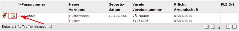 Mit einem Klick auf auf die Schaltfläche "Suchen" wird Ihre Suchanfrage gestartet. Das Ergebnis Ihrer Suchanfrage wird Ihnen in einer Trefferliste präsentiert. (siehe Screen "Spielersuche Trefferliste")
