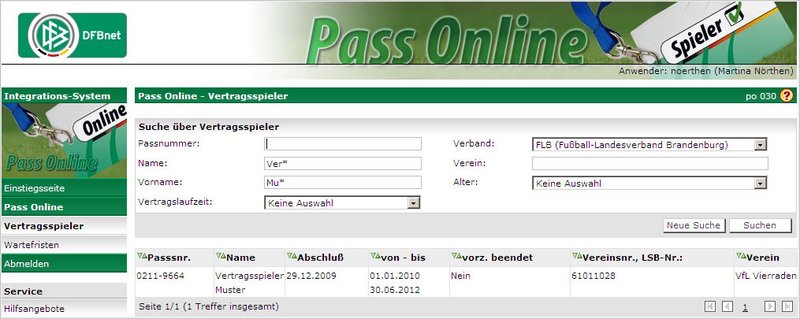 Zur Abfrage eines Vertragsspielers geben Sie bitte die Passnummer des entsprechenden Spielers ein.