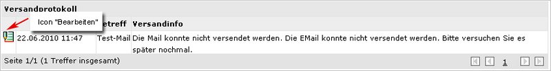 Automatisch erzeugt das System ein Versandprotokoll mit einer entsprechenden Statuszeile, ob die Email versendet worden konnte. Das Versandprotokoll wird im System automatisch gespeichert, so dass jederzeit eine Recherche möglich ist. Um das Versandprotokoll einzusehen, muss der Benutzer auf das Icon „“ drücken. Anschließend zeigt ihm das System die entsprechende Email mit den dazugehörigen Daten.