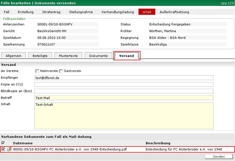 Letzter Schritt in dem Prozess ist die Versendung der Dokumente per Mail. Das System ermöglicht nach Generierung der Vorgangsdokumente eine Versendung der Dokumente an die Vereine und Beschuldigten.