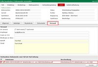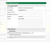 Automatisch erzeugt das System ein Versandprotokoll mit einer entsprechenden Statuszeile, ob die Email versendet worden konnte. Das Versandprotokoll wird im System automatisch gespeichert, so dass jederzeit eine Recherche möglich ist. Um das Versandprotokoll einzusehen, muss der Benutzer auf das Icon „“ drücken. Anschließend zeigt ihm das System die entsprechende Email mit den dazugehörigen Daten.