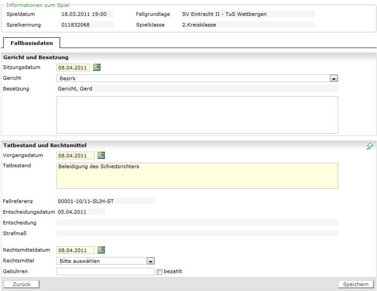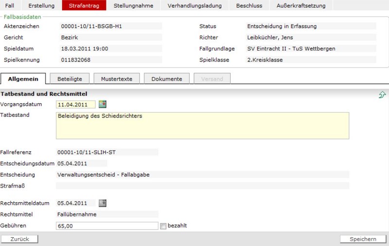 Im Bereich „Tatbestand und Rechtsmittel“ wird die Fallreferenz aus dem Referenzfall direkt übernommen. Das Datum de Urteils wird unterhalb des Tatbestands angezeigt. Das Datum des Urteils kann herangezogen werden, um zu überprüfen, ob die Rechtsmittelfrist eingehalten wurde.