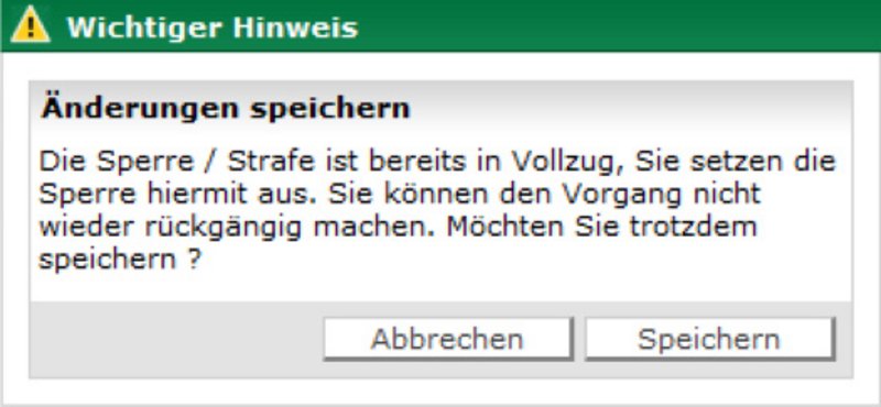 Mit dem Klick auf das Icon „Sperre aussetzen“ in der Trefferliste der Fallsuche öffnet sich eine neue Seite mit den Sperren, Geldstrafen und Kosten aus der Vorinstanz. Auf dieser Seite kann der Anwender die Sperre, die Geldstrafe oder die Kosten aussetzen. Eine Abhängigkeit der 3 Punkte untereinander ist nicht gegeben, somit ist jede beliebige Kombination untereinander möglich.