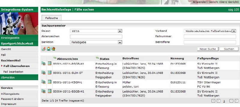 Im Menü gibt es unter „Rechtsmittel“ den Menüpunkt „Fall übernehmen“. Über eine Suche erhält der Anwender die Fälle, für die er berechtigt ist, zur Bearbeitung bzw. zur Übernahme angeboten. Wird ein vorhandener Fall ausgewählt, so wird der neue Fall bei der Anlage mit dem vorhandenen Fall der Vorinstanz verknüpft.