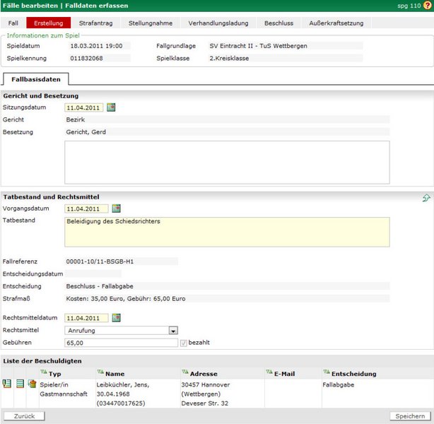 Mit der Speicherung durch den Button „Speichern“ werden dann die Beschuldigten aus dem Fall der Vorinstanz aufgelistet.