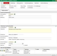 In den weiteren Vorgängen werden nun zusätzliche Fallreferenzen, Strafmaß, Gebühren, Entscheidung und Rechtsmitteldatum angezeigt. Im Tabreiter Dokumente sind auch alle Dokumente aus dem referenzierten Fall vorhanden. Die Möglichkeit zur Unterscheidung der Dokumente zwischen Ursprungsfall und Rechtsmittel ist durch die verschiedenen Aktenzeichen bei den Dokumenten gegeben.