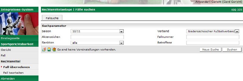 Generell stehen mit der Fallsuche unter dem Menüpunkt „Rechtsmittel“ – „Fall bearbeiten“ nur die Rechtsmittel zur Verfügung, die dem Gericht des aktuellen Bearbeiters zugeordnet sind.