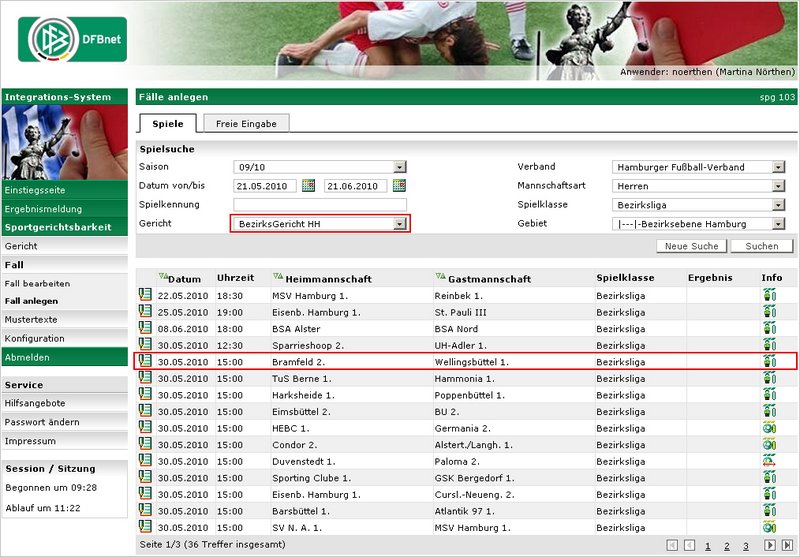 Zunächst wird ein Spiel gesucht (siehe Screen "Spiel-Suchen"). Anschließend wird das Icon "Spiel bearbeiten" des entsprechenden Spiels ausgewählt, geöffnet wird der Karteireiter "Fallbasisdaten", in dem der Tatbestand eingetragen und gespeichert werden muss.
