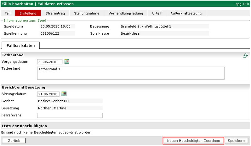 Ein zentraler Bestandteil der Sportgerichtsbarkeit, insbesondere als Vorstufe der Fallbearbeitung, ist die Fallanlage durch den Richter oder Staffelleiter. Das System unterstützt die Verarbeitung von mehreren Beschuldigten pro Fall. Gibt es mehr als einen Beschuldigten für einen Fall, dann wird für jeden Beschuldigten ein Vorgangsdokument erzeugt.
