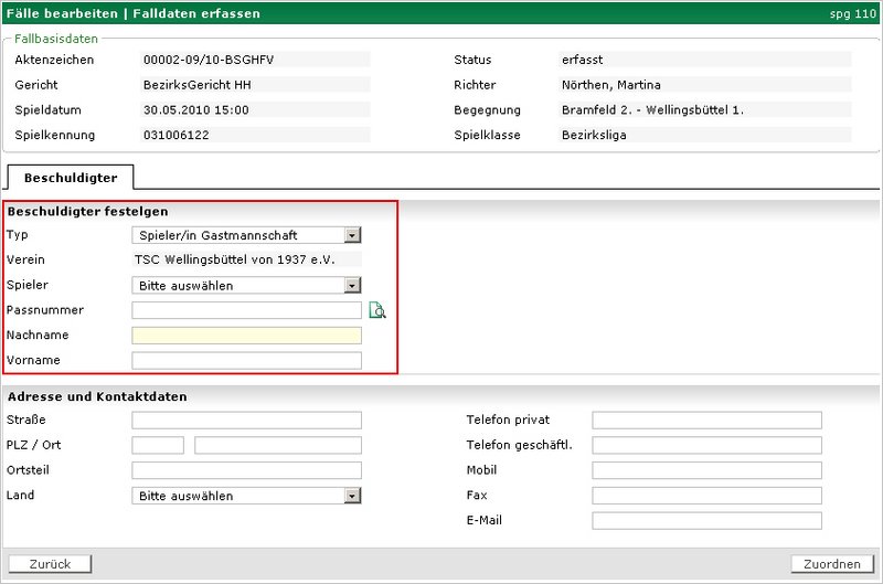 Nach Auswahl des Buttons "Neuen Beschuldigten zuordnen" kann eine freie Erfassung der Personendaten erfolgen (siehe Screen "Beschuldigten erfassen"). Das System ermöglicht eine Suche über die Passnummer eines Spielers, Ausweisnummer eines Schiedsrichters, Vereinssuche, eine Vorauswahl von Spielern über die Spielberechtigungsliste, wenn ein Spielbericht vorhanden ist