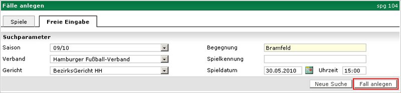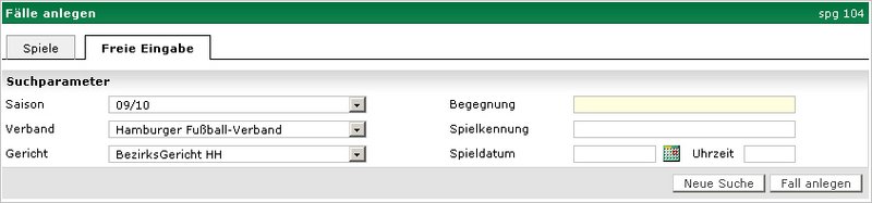 Bei Neuanlage müssen alle Fallbasisdaten erfasst werden. Dazu gehören die Erfassung der Hauptelemente des Falls bestehend aus dem/der Betroffenen, der/die das Vergehen begangen hat/haben. Gegebenenfalls umfassen die Fallbasisdaten auch die Daten des Spiels, bei dem sich der Vorfall ereignete. Es gibt in der Sportgerichtsbarkeit 2 Modi – die Fallerstellung über die Spiele-Suche (siehe Screen "Spiele-Suchen") oder über die freie Eingabe (siehe Screen "Freie Eingabe").